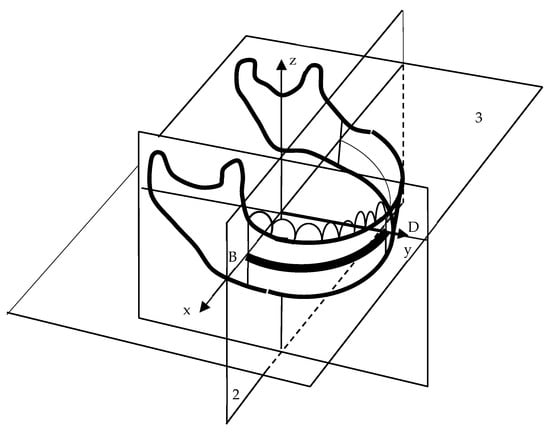 The mandibular bone is symmetrical in relation to vertical plane 1 that passes through the middle of the body. The mandible is sectioned with plane 2 in such a way as to isolate of the mandible body from the two branches. For simplicity, the body is considered as a semicircle (Figure 1).