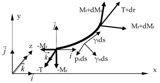 In the current point A(s) of the middle fiber of the spring, the mobile triad is directly associated, so that and are unit vectors along the tangent and normal to the spring. An element of the spring between the abscissas s and s + ds is isolated (Figure 4).