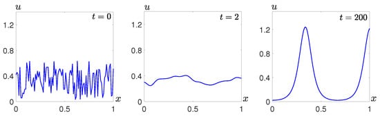 In the following example, the initial state for the numerical simulation is formed as the point of the interval connecting two coexisting deterministic patterns  and . The  pattern is defined by the functions , , and the  pattern is defined by , . We consider the linear combinations (11) as the initial states for the experiments, with the parameter k varying within :