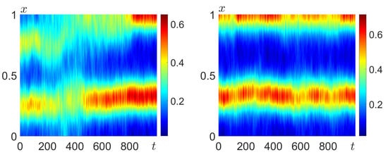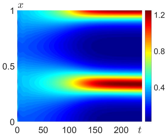 Alternatively, the evolution of the system dynamics can be visualized using heat maps. Figure 3 shows the process of pattern formation as in Figure 2. Here, the spatial variable x varies along the vertical axis, the temporal variable changes along the horizontal axis, and the color represents the value of  at the point of the spatial domain at a certain time t.