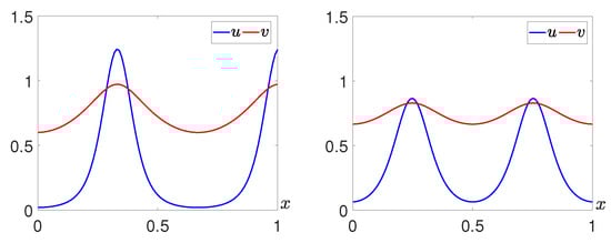 In the system with diffusion, the homogeneous equilibrium is considered. In this state, for every x, the variable values are those of the fixed point of the system without diffusion. If this equilibrium is unstable in System (1), (2) with , the diffusion instability, namely the Turing instability [], is observed and the system will form a stable non-homogeneous state (Turing pattern). For System (1), (2) without noise (), the condition for the Turing instability is as follows []: