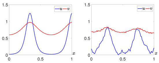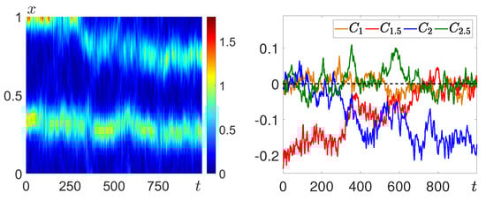 Let  be the discretization of the spatial domain , where . Denote , , where ,  are the coordinates of the pattern–attractor of the deterministic system. For the stochastic systems (1), (2), S is an identity -matrix and the matrix F is defined as follows: