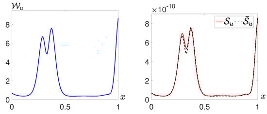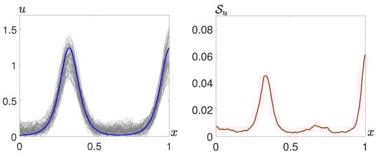 Under the effect of random noise, the system leaves the stable pattern–attractor of the deterministic model and generates a random state. The solutions form a probabilistic distribution around the initial deterministic pattern, as visualized in Figure 7 (left). The solid blue curve is the u-component of the deterministic  pattern. The thin gray curves show the u-components of the generated states around the deterministic pattern considered the initial state in stochastic modeling. Figure 7 (right) shows the mean-square deviation of the random states from the initial pattern for each x within the spatial domain.