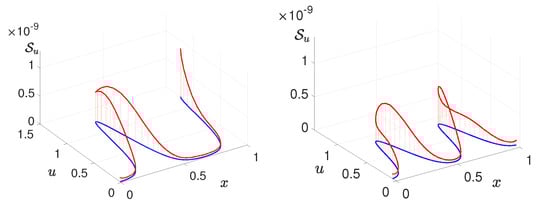 Figure 8 demonstrates the results of the statistics obtained from the numerical simulations for patterns  (left) and  (right), shown by blue curves. Note that  (red curve) is a non-homogeneous function: the dispersion varies along the pattern. This implies that not only do different patterns show different sensitivities but also the sensitivities vary from one part of the pattern to another. In these experiments, the intensity of the random perturbations was considerably decreased in order to exclude the transitions between patterns.