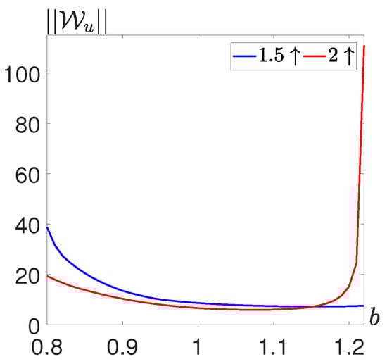 For visualization, comparison, and parametric analysis of the stochastic sensitivity, it is often useful to have a numeric measure, for example, a -norm: . Figure 10 shows how this metric changes under the variation of the parameter b for  and  patterns. Note that near , the stochastic sensitivity of the  pattern rapidly grows, unlike the  pattern.