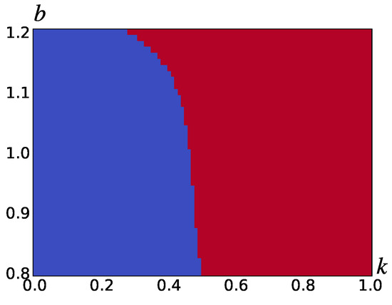 Note that for , the initial state is exactly the  pattern, and for , it is the  pattern. The parameter k is varied and for each experiment after the transient process (), the Euclidean distance between the solution of the deterministic system and both patterns is measured. If the final state is closer to , then k is marked in blue, and if it is near , then k is marked in red. The results of our numerical experiments are presented in Figure 11 in the plane . This figure allows one to compare the basins of the  (red) and  (blue) patterns in this multi-dimensional system.