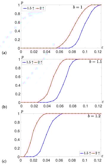 Figure 12 shows the results of this experiment. Here, the probability of pattern destruction is displayed for the aforementioned values of b versus the noise intensity . This probability is shown in blue for the  pattern and red for the  pattern.