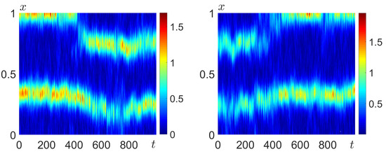 Another example is shown in Figure 14 for , . Note that for this b, the critical values of the noise intensity are  and . This difference in the critical values is essential so for , the  pattern is expected to be destroyed, whereas the  pattern is expected to remain relatively resistant. These scenarios of noise-induced transitions predicted by the SSF technique and confidence domain method are justified by the direct numerical simulation in Figure 14. Indeed, this noise causes  (left), whereas the  pattern is resistant to noise of this intensity. This can be also seen in Figure 12c: the probability of the destruction of the  pattern is almost zero, whereas for the  pattern, this probability is approximately 0.6. Therefore, only unidirectional transitions  are expected here.