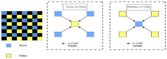 This new representation, also known as primal lifting, causes a change in specific basic properties, such as the signal’s mean. To preserve this property, a primal lifting step is required to update; hence, is updated with data computed from the new sequence .