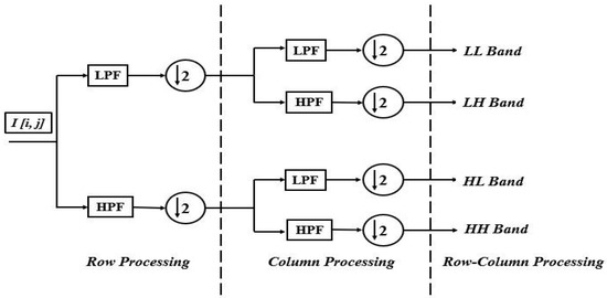 Wavelet transforms are used to operate on an image in the time-frequency domain. In a wavelet transform, a discrete signal is subjected to a high pass filter and a low pass filter and downsampled, the outputs of which are high (HP) and low (LP) frequency signals, both having half as many samples as the input signal [17,18,19,21]. The method proposed in [20] shows how a Discrete Wavelet Transform (DWT) can split an image into its wavelet sub-bands. Another image can then be embedded directly into the decomposed sub-bands for watermarking. Similarly, scrambling an image’s sub-bands can lead to a decreased correlation between the pixels in a lower number of iterations. The Lifting Wavelet Transform (LWT) is a reversible wavelet transform that is computationally efficient, incorporates floating-point operations, and is easily implementable on hardware [19]. The Lifting Scheme is also faster and more efficient than other schemes. For instance, it has advantages over DWT, such as the transform’s ability to retain invertibility despite a local modification.