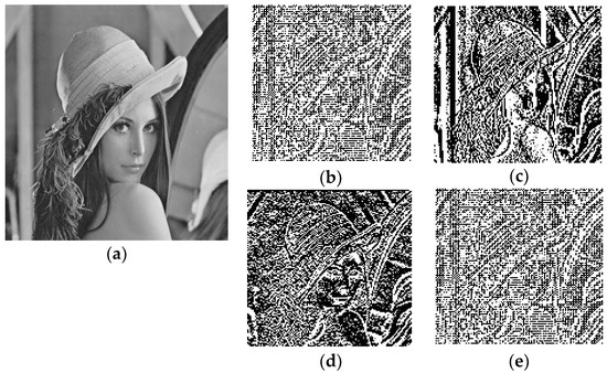 (a) Input Lena Image; (b) LL, (c) HL, (d) LH, and (e) HH sub-bands of decomposed Lena image after LWT.