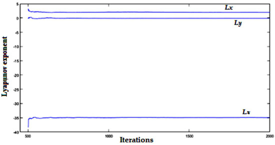 A positive Lyapunov exponent indicates an unstable orbit that shows chaotic properties. The points initially nearby will diverge regardless of how close they are. There will be a Lyapunov exponent for a 3D chaotic system, such as the proposed one, for every dimension, i.e., Lx, Ly, and Lz. A system can be declared chaotic if at least one of these dimensions displays a positive Lyapunov exponent over many iterations. Figure 9 illustrates how the Lyapunov exponents of the proposed hybrid map vary as iterations progress. Here, the 1st 500 iterations have been ignored to eschew the influence of the initial state. It is observed across 2000 iterations that Lx remains positive with a value of around 2. This implies that the proposed Hybrid Chaotic map is in a chaotic state.