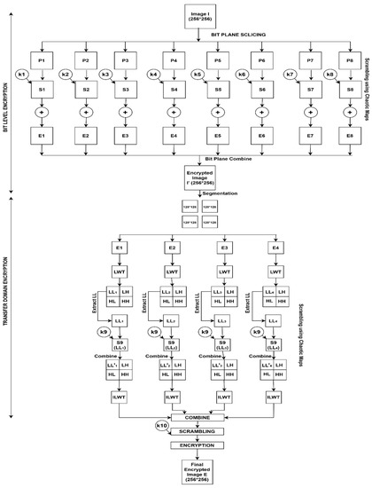 With the growing demand for digitalization, multimedia data transmission through wireless networks has become more prominent. These multimedia data include text, images, audio, and video. Therefore, a secure method is needed to modify them so that such images, even if intercepted, will not be interpreted accurately. Such encryption is proposed with a two-layer image encryption scheme involving bit-level encryption in the time-frequency domain. The top layer consists of a bit of plane slicing the image, and each plane is then scrambled using a chaotic map and encrypted with a key generated from the same chaotic map. Next, image segmentation, followed by a Lifting Wavelet Transform, is used to scramble and encrypt each segment’s low-frequency components. Then, a chaotic hybrid map is used to scramble and encrypt the final layer. Multiple analyses were performed on the algorithm, and this proposed work achieved a maximum entropy of 7.99 and near zero correlation, evidencing the resistance towards statistical attacks. Further, the keyspace of the cryptosystem is greater than 2128, which can effectively resist a brute force attack. In addition, this algorithm requires only 2.1743 s to perform the encryption of a 256 × 256 sized 8-bit image on a host system with a Windows 10 operating system of 64-bit Intel(R) Core(TM) i5-7200U CPU at 2.5 GHz with 8 GB RAM.