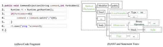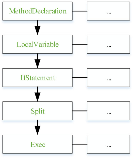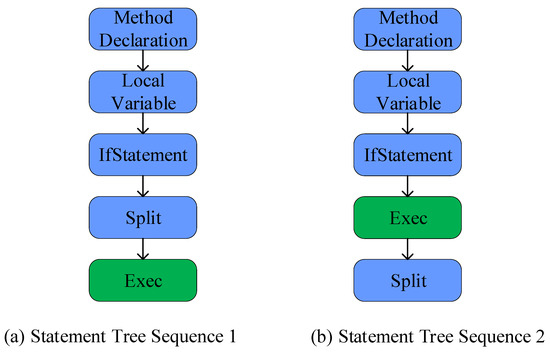 However, the depth-first algorithm used in [7] and most studies based on AST when dealing with AST will have the problem of tree structure information loss. We take the two methods in Figure 4a as an example (for simplicity, only the root nodes in the statement tree were drawn to illustrate the problem), the java method “danger” is a method with command injection vulnerability (CWE78), the method “safe” is a method without CWE78.