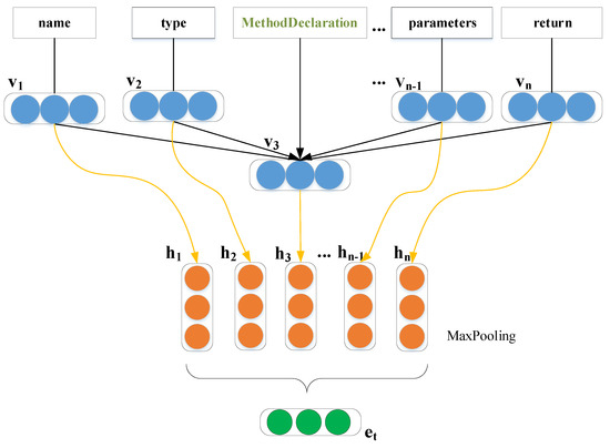Concretely, given a statement tree node which has no leaf, first, we use Equation (1) to perform word embedding on node n to obtain the vector representation of n. In Equation (1), is one-hot representation of node n, is a weight matrix, d is the word embedding dimension, V is the vocabulary size, and ⊤ is matrix transpose operation.