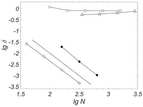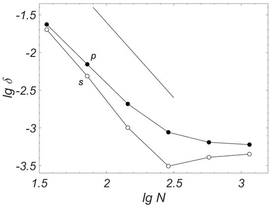 It can be seen that the curve tends to a straight line, the slope of which is . This means that when the spatial grids thicken, the error decreases, and the rate of its decrease is , which corresponds to the second order of accuracy of the finite-difference scheme. At the same time, the proposed scheme provides high quantitative accuracy: already on the grid with steps, the error is %. This is enough for practical applications.