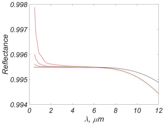 Now let the plate be metal with . This value corresponds, for example, to the dielectric constant of silver at a wavelength of 1.5 microns. The considered wavelengths lie in the range microns; its lower boundary is the middle of the visible range, and the upper one is the end of the second transparency window for thermal imaging.