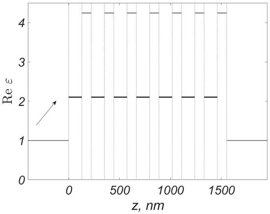 1. Consider a layered structure consisting of Q isotropic plane-parallel plates with a total thickness of a. Let the coordinate axis z be perpendicular to the plates; the axes x and y are located in the plane of the plates. Denote the coordinates of the layer boundaries by . At and , semi-infinite dielectric media are located. We denote their dielectric permittivity and magnetic susceptibility by , (for ) and , (for ). We assume these media to be homogeneous and isotropic.