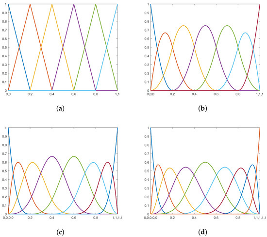 where B i p ( u ) is the B-spline basis function and ω i is the corresponding weight. In particular, when all the weights are 1, { N i , p } i = 0 , , N are equal to B-spline basis functions { B i p } i = 0 , , N . Figure 1 shows the B-spline basis functions under different orders with the same breakpoint sequence. Each parameter interval [ u i , u i + 1 ] has p + 1 related local bases, for which the property of local support is essential to the analysis.
