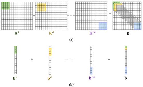 Figure 2. Assembly. The superscript stands for the number of the element. (a) Stiffness matrix. (b) Load vector.