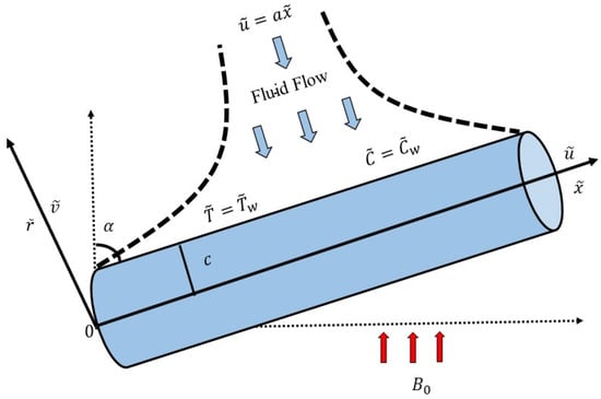 The heat and mass transfer aspects are considered simultaneously in the stagnation point Casson fluid flow regime, subject to inclined flat and cylindrical surfaces. The novelty is increased by considering the magnetic field, heat generation, mixed convection, viscous dissipation, thermal radiations, and variable thermal conductivity. The geometry of the problem is offered in Figure 1. The Casson [,,] is mathematically modelled as follows: