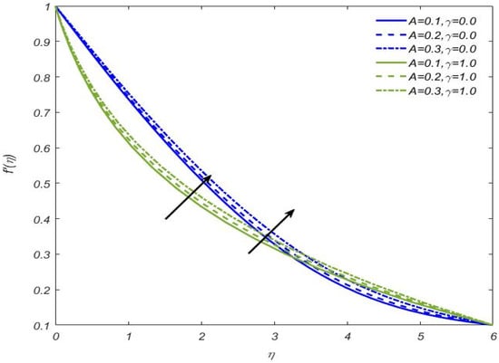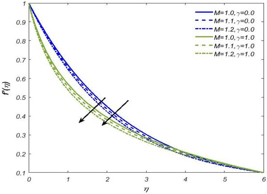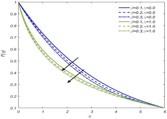 These parameters are majorly influencing fluid flow. Equation (12) shows the energy equation with some parameters affecting it, namely curvature parameter, Ec as Eckert number, thermal radiation parameter as R, heat generation parameter as H, Prandtl number is symbolized as Pr. Equation (13) gives us concentration equation containing curvature parameter and Schmidt number . Equations (14) and (15) represent the reduced boundary condition for Equations (11)–(13). In Equation(16), we have the mathematical relation of each flow parameter. Equation ( 17) states the mathematical form of the skin friction coefficient; on the other hand, Equation (18) works for the mathematical interpretation of the Nusselt number. In Equation (19) we get the mathematical exercise of the Sherwood number. For deep observation of the impact of the flow parameter of the flow field, we solved Equations (11)–(15) by using the shooting method and Runge–Kutta algorithm. Our key interest is to examine the heat and mass transfer aspects of Casson fluid flow towards both flat and cylindrical surfaces. The observed outcomes are shown in the form of graphs and tables. In this regard, we offered Figure 2, Figure 3, Figure 4, Figure 5, Figure 6, Figure 7, Figure 8, Figure 9, Figure 10 and Figure 11. In detail, Figure 2, Figure 3 and Figure 4 show the effects of the Casson fluid parameter, magnetic field parameter, and velocities ratio parameter. Figure 2 represents the sequel of the Casson fluid parameter on fluid velocity. We have seen that the fluid velocity admits the inverse behavior. It gradually declined when we enhanced the value of the Casson fluid parameter. It is noted that such a fall is similar for both situations; either we have considered fluid flow over a plate or cylindrical surface. The relationship between a magnetic field and Casson fluid velocity is shown in Figure 3. It exhibits the opposite behavior; as we boost the magnetic field parameter, the Casson fluid velocity begins to decline. It exhibits the same effects on both plate and cylinder, but for a given magnitude of the magnetic field the velocity on the cylinder is somewhat less than that on the plate.