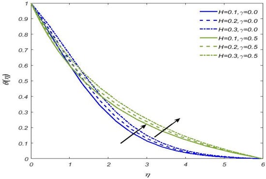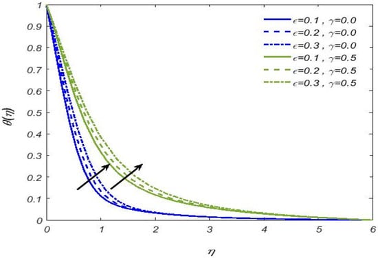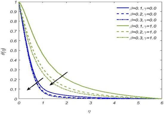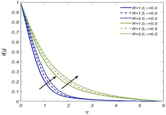 Higher values of magnetic field parameter cause increment in Lorentz force, and hence resistance encountered by fluid particles increases. This leads to a decline in fluid velocity. Figure 4 illustrates the impact of the velocity’s ratio parameter. We have shown that the Casson fluid velocity is directly impacted by the velocity’s ratio parameter, with greater values of the parameter leading to bigger magnitudes of fluid velocity. This impact is the same for both flat and cylindrical surfaces. It is important to note that the velocity ratio parameter shows the ratio of the free stream to the stretching velocity of Casson fluid. When the ratio parameter has a value lower than one, it is inferred that the role of the free stream is less important than the stretching velocity. As a result, the inclined surfaces are causing considerable disturbance in fluid flow. The impact of thermal radiation, Casson fluid, heat generation, variable thermal conductivity parameters, Prandtl and Eckert numbers on Casson fluid temperature is observed. Figure 5, Figure 6, Figure 7, Figure 8, Figure 9 and Figure 10 are plotted in this direction. In detail, the effect of a thermal radiation parameter on Casson fluid temperature is shown in Figure 5. As the thermal radiation parameter increases the temperature begins to rise, and we can see that both a plate and a cylinder admit a similar effect. The strength of the Casson temperature at the cylinder is higher than the plate. Greater values of radiation parameter produce thermal energy, and hence temperature increases. Figure 6 shows the relation between Casson fluid parameter on the fluid temperature. In contrast to its impact on Casson fluid velocity, it displays an inverse relationship. We have seen that the Casson fluid temperature decreases as the Casson fluid parameter increases. The impact is similar for both plate and cylindrical surfaces. Figure 7 shows the impact of the Prandtl number on the temperature of the Casson fluid. It has the same impact that the Casson fluid parameter does.