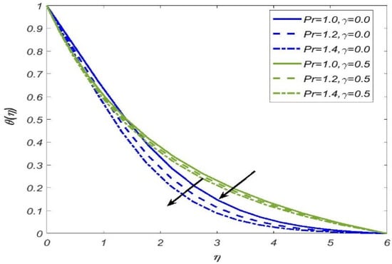 The Prandtl number admits an inverse relation towards thermal conductivity and hence the higher values of the Prandtl number cause decline in thermal conductivity as a result the temperature drops.