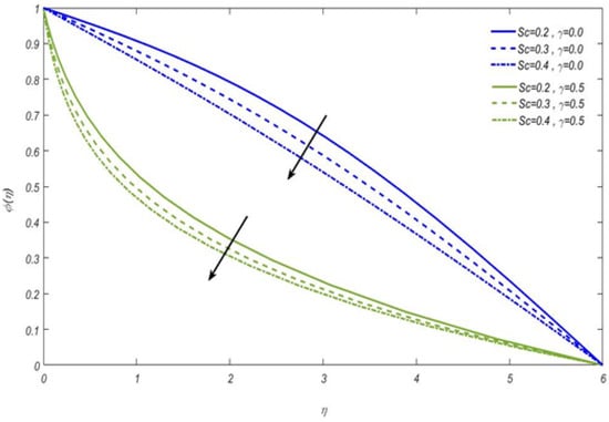 Figure 11 offers the simulation for both cylindrical and flat surfaces. We have seen that for higher values of the Schmidt number the concentration profile admits a declining nature. Such impact is similar for both cylindrical and flat surfaces. We have considered heat and mass transfer aspects, and hence three different physical quantities at the surface are considered to evaluate, namely skin friction coefficient, Nusselt number, and Sherwood number.