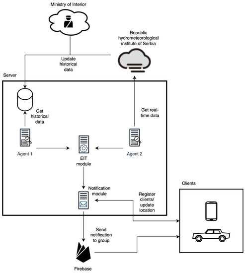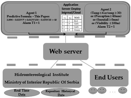 For the evaluation of the impact of these factors on TI, we can find in the literature several classic statistical methods, and the most used among these is regression analysis, followed by factor and discriminant analysis and, on the other hand, some algorithms of data mining and artificial intelligence—between which, the most used are artificial neural networks and different algorithms of classification. Practically, this process means that the choice of the subset from the set of parameters must lead to the problem of the feature selection before creating a prediction [9]. Having in mind these facts, the authors set out to provide the report on one research method as the main objective of this manuscript, and the advantage of aggregation in the prediction model for determining the impact of the meteorological factors on TI in two methods will be discussed. These two methods that the authors proposed are the most used methods from the previously mentioned two groups, both in one ensemble ML prediction model: from the group of statistical methods, binary regression and from the group of ML methods, classification with feature selection. Moreover, as an obligatory part of this research was considering the realization of a developed ensemble model as one multi-agent system (MAS) in a global case, concrete in this paper is a two-agent system in which agent 1 draws knowledge through ML from historically available data, and then agent 2 deals with those same parameters, but in real time. Such two-agent architecture enables decision making using the algorithm which could be a decision matrix from the group of decision makers, and this will be proposed in the paper in the section which deals with the technical solution of the implementation of the proposed MAS including one emergent intelligence technique which enables the integration of MAS into a collaborative whole precisely based on that algorithm. Having in mind the complexity of the considered problem and the already-mentioned fact that the impact of meteorological factors on TI is only one small part of all the groups of factors—such as the presence of human factors, vehicle factors, other environmental parameters from different particles in the atmosphere including air pollution, road factors, geographical factors as well as factors of economic development and so on—it is an obvious need that this model implementation with one MAS must enable its permanent, continuous upgrading. Such a solution, based on the approach of using MAS in the proposed form, the authors could not find in the literature.