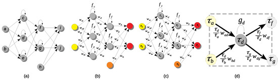 (a) Network quiver Q as introduced by [1]. (b) Neural network based on Q with weights W and activation functions f. Input, hidden, bias, and output neurons are in yellow, gray, orange and red, respectively. (c) Same neural network but with a change of basis (CoB) at each neuron . (d) Neural teleportation of the weights attached to neuron d. The resulting activation function is .