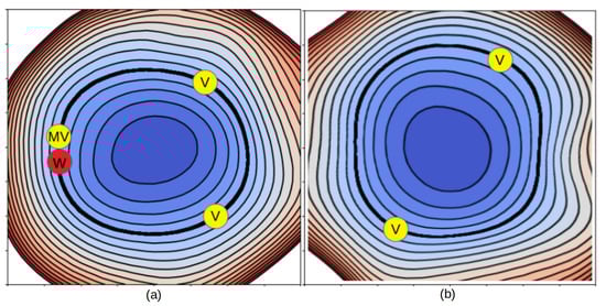 (a) 2D slice of a loss landscape with a W dot as the location of a given network. The V dots are two teleported versions of W inside the same landscape while the MV dot stands for a micro-teleportation of W. (b) The dots are teleported versions of W in a different loss landscape. Since neural teleportation preserves the network function, the six networks have the same loss value. In the case of ReLU, for example, the teleported networks with intra-landscape teleportation lie in the same landscape.