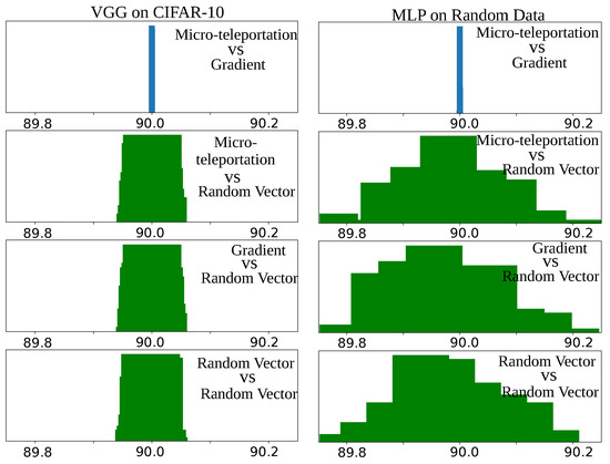 (Top) Angle histograms between micro-teleportation vectors and back-prop. gradients for VGGnet on CIFAR-10 data and MLP on random data. The other rows are angle histograms between micro-teleportation vectors and random vectors, between gradient and random vectors and between random vectors.
