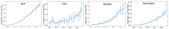 Mean absolute difference (±std-dev) between the back-propagated gradients’ magnitudes of teleported networks and their original (non-teleported) network. Larger CoB generate larger gradients.