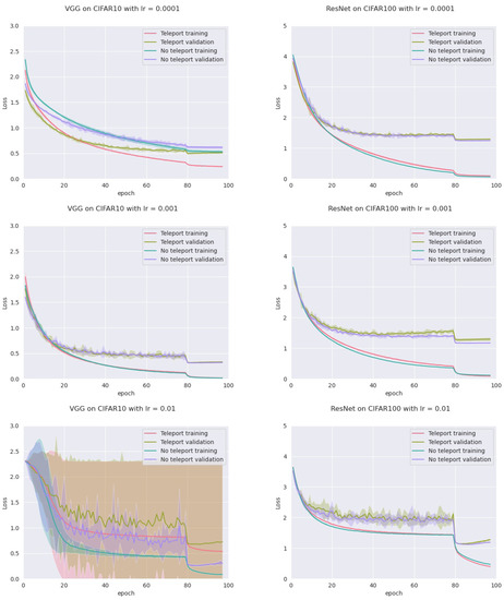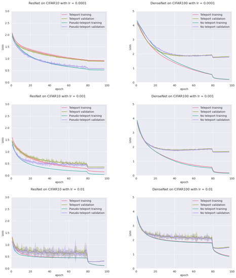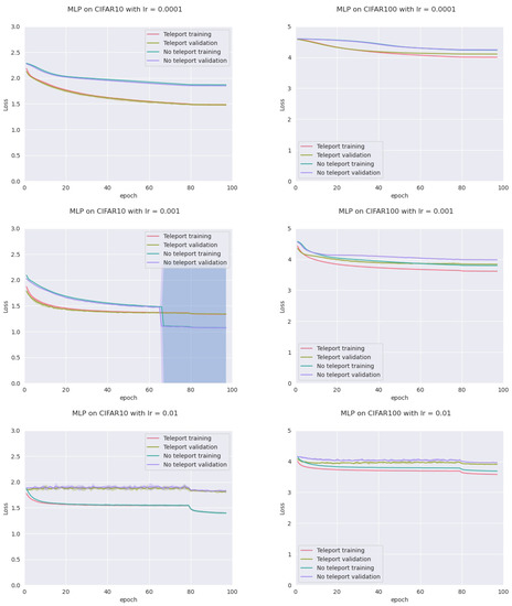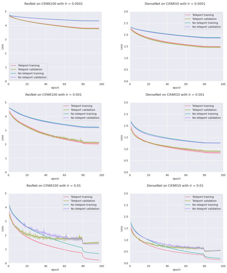 In order to assess this, we trained four models: an MLP with five hidden layers with 500 neurons each, a VGGnet, a ResNet18, and a DenseNet, all with ReLU activation. Training was conducted on two datasets (CIFAR-10 and CIFAR-100) with two optimizers (vanilla SGD and SGD with momentum), and three different learning rates (0.01, 0.001 and 0.0001) for a total of 72 configurations. For each configuration, we trained the network with and without neural teleportation right after initialization. Training was performed five times for 100 epochs. The chosen CoB range is with an inter-landscape sampling for all these experiments. The teleported and non-teleported networks were initialized with the same randomized operator following the “Kaiming” method.