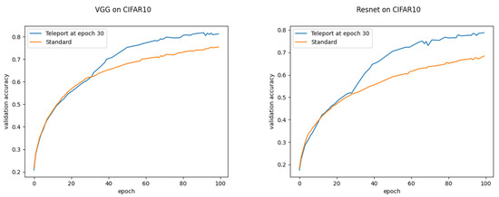 Validation accuracy for VGG (left) and ResNet (right). We plot two curves for each model, the orange curves are the usual SGD training and the blue curves are SGD with one teleportation at epoch 30.