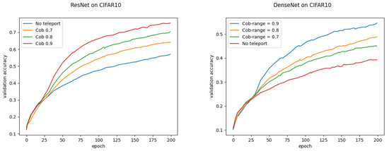 For all the previous experiments, we teleported the neural networks at the beginning of the training. Finally, we performed another set of experiments by teleporting the neural network once at epoch 30. We can clearly see the jump in accuracy right after the teleportation in Figure 11. In Figure 12, we compare the training curve of a model with a training where we teleport once at epoch 30 with different CoB-ranges of , and . We can see how the bigger the Cob-range, the higher the impact on validation accuracy. Experiments shown in Figure 11 and Figure 12 were run with a learning rate of on CIFAR-10.