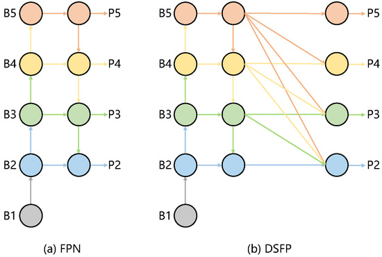 (a) FPN introduces a top-down pathway and lateral connections to fuse multi-level features from level 2 to 5 (P2–P5). (b) Our DSFP adds high-to-low aggregating pathways and lateral connections, and it mainly can enrich semantic information of low-level feature maps.
