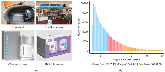 In order to obtain efficient feature representation in object detection, existing methods [17,18,19,20,21] usually adopt preset anchor boxes in training. However, large aspect ratio objects exist all the time for logos in reality. As shown in Figure 2a, logos like “napapijri” and “coffee beanery” are extremely wide, while logos like “luciano soprani” and “simple human” are extremely tall, making it challenging for logo detectors to detect these kinds of logo objects. Figure 2b shows LogoDet-3K dataset [22], there are about 35% logo objects with an aspect ratio greater than 3. This challenge leads to the inefficiency of logo detection using the preset anchor boxes, which may produce a large number of regions of negative samples.