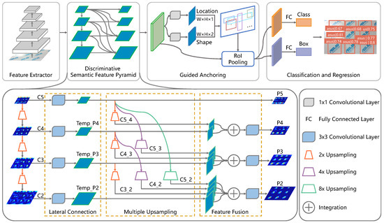 Overview of the proposed Discriminative Semantic Feature Pyramid Network with Guided Anchoring (DSFP-GA). Feature Extractor: we use the ResNet-50 as the backbone to extract feature information. Discriminative Semantic Feature Pyramid: we propose the DSFP to obtain discriminative semantic features. It mainly contains lateral connection, multiple up-sampling, and feature fusion. Here denotes the feature map from stage i of the CNN backbone, and denotes the corresponding feature pyramid level on DSFP. Guided Anchoring: we adopt the GA to generate anchor boxes that can detect a large aspect ratio, and then determine whether it belongs to foreground or background and then apply preliminary bounding box regression. Classification and Regression: output the corresponding category and the final localization.