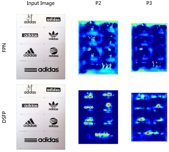 Clearly, the DSFP can perform better than the FPN for logo detection tasks. This is because that it can extract more discriminative semantic features. To verify this, we visualize the heatmap in Figure 4, which demonstrates that the DSFP is more effective in extracting discriminative semantic features for logo detection. The results prove that the red areas of and in DSFP are more accurate and have richer semantic information than those in the FPN. It is noteworthy that feature maps that come from the DSFP are more representative since they have stronger activation values in the foreground and weaker activation values in the background.