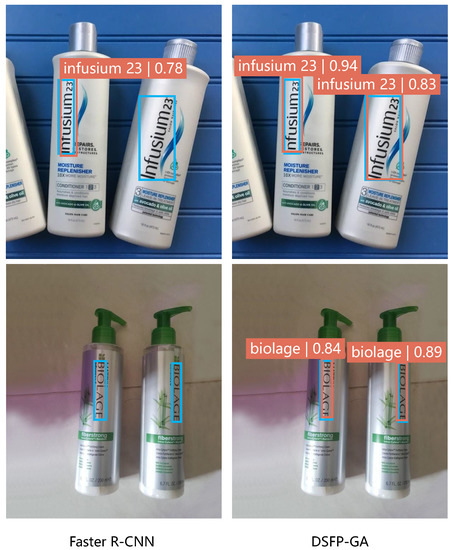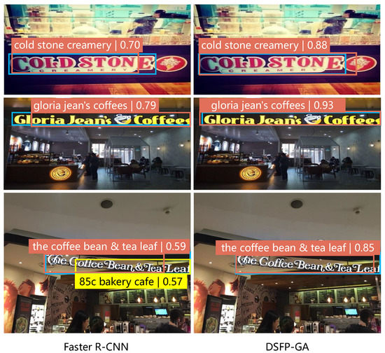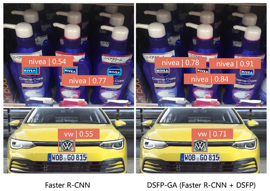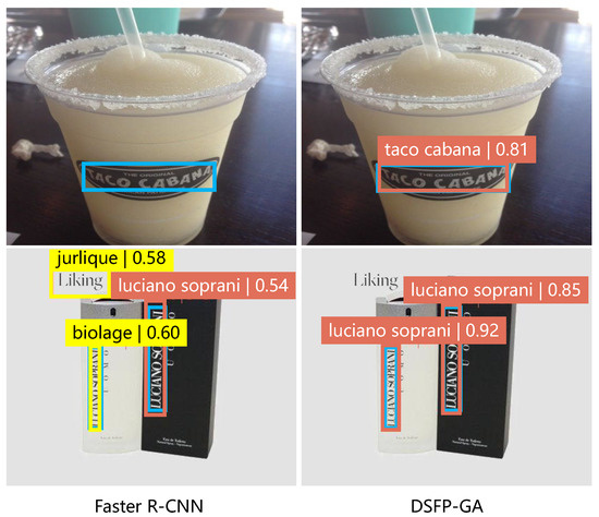 In order to evaluate the better performance of DSFP-GA, we selected two images that contain both small size and large aspect ratio logo objects and visualized the detection results. As shown in Figure 8, Faster R-CNN doesn’t detect the logo object that is small and wide in the first image. On the same image, DSFP-GA has better results in localization and classification. In the second image, Faster R-CNN mistakenly detects two logo objects and the accuracy of another logo object detected by Faster R-CNN is much lower than DSFP-GA. This amply demonstrates the superior performance of DSFP-GA in both small size and large aspect ratio logo object detections.