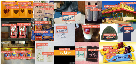 Detection results of DSFP-GA given in Figure 9, clearly demonstrate that our model has superior performance in detecting all kinds of logos of various sizes and shapes. We can see from Figure 9 that our model has better detection results on large logo objects (category “cherry 7up”, category “waffle house”, etc.), medium logo objects (category “cheez whiz”, category “swiss miss”, etc.), and small logo objects (category “freia”, category “nioxin”, etc.). It is worth mentioning that there are multiple multi-scale objects in a test image from Figure 9, where our model also can detect all logo objects accurately. These prove our method can well detect logo objects of different sizes and has the capacity to handle multiple logo objects within one image.