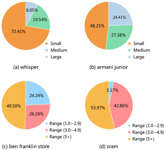 The proportion of small, medium, and large logo objects in categories “whisper” and “armani junior”, the proportion of different aspect ratios in categories “ben franklin store” and “sram”.