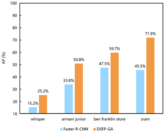 The small logo objects in the “whisper” category have 72.41% of the proportion in Figure 10a. As shown in Figure 11, the AP value is 15.2% in this category on Faster R-CNN. DSFP-GA improves by 10% AP over Faster RCNN. Similarly, in Figure 10b, small logo objects account for nearly half of the proportion in the “armani junior” category. DSFP-GA again improves by 17% AP over Faster R-CNN. It is observed that our method has a vast performance improvement in small logo detection. As for the categories of “ben franklin store” and “sram”, we can see that large aspect ratio logo objects account for a large proportion (49.50% and 53.97%) in Figure 10c,d. As shown in Figure 11, DSFP-GA increases by 12.2% and 26.4% AP over Faster R-CNN respectively. Faster R-CNN cannot deal well with large aspect ratio logo objects through the preset anchor boxes. However, DSFP-GA performs better in these two categories, indicating that DSFP-GA has a superiority in detecting large aspect ratio logo objects over the state-of-the-art Faster R-CNN.