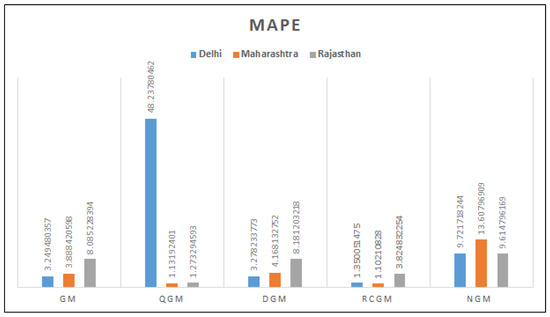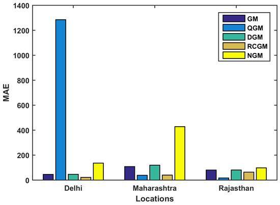 - Inspecting the results of Delhi, we observed that the values of infected cases in the Capital is accurately predicted by RCGM as the value of MAPE is optimal as compared to others. Also, it is observed that the values of MAPE are optimal for state of Maharashtra and Rajasthan. The analysis of the MAPE values are depicted in Figure 3. Addition to that analysis MAE is for these places are also depicted in Figure 4.