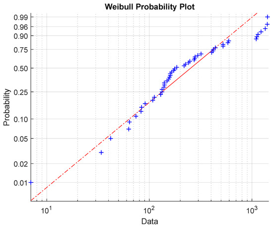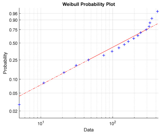 The same conclusion leads by applying the Chi-square goodness-of-fit test to the data cited in [7,27]. Once again, we accept that the distribution is a Weibull at the level of significance; see Figure 4, and the estimated shape and scale parameters given by Matlab are, respectively, and .