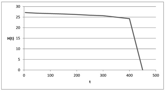 which can be seen as a dynamic measure of uncertainty about S associated to its lifetime distribution. In other words, measures the expected uncertainty contained in conditional density of the residual lifetime of a system (or component) of age t, i.e., given . In this sense, measures the concentration of conditional probability distributions. Note finally that the dynamic entropy of a new component (of age 0) is the ordinary Shannon’s entropy and that the function uniquely determines the reliability function , or equivalently, the PDF F.