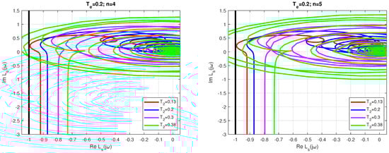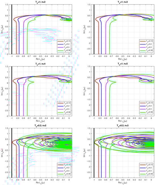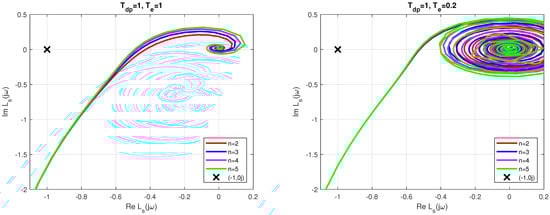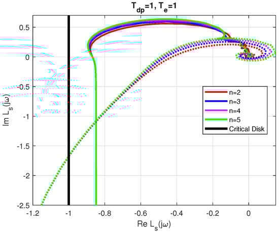 (Dominance of proposed poles). The closed-loop system with transport delay generally has an infinite number of complex conjugate poles that can affect the stability of the closed-loop system. The stability of the dominant poles (14) is guaranteed by their negative sign. The stability and performance of the entire closed loop can be most easily checked by evaluating the shape of the Nyquist curve (see Figure 2). When the angular velocity ω (parameter of the Nyquist curve) increases for all considered n, the curve passes through the critical point on the left side with a sufficient margin. As can be seen from the Nyquist curves, the neglected complex poles of the circuit represented by the cycles around the origin, with the crossing points with the negative real axis closer to the critical point, obviously do not reduce the stability. Thus, although there are infinitely many stable conjugate complex poles, they do not significantly affect the linear step responses. These remain smooth with a minimum number of monotonic intervals for setpoint and disturbance step responses (see Figure 3). However, if the calculated is further reduced, the influence of neglected poles could already lead to a shift of the intersection points of the Nyquist curve closer to the critical point. In the time domain, this would contribute to a deformation of the ideal waveforms and could even lead to an instability of the loop.