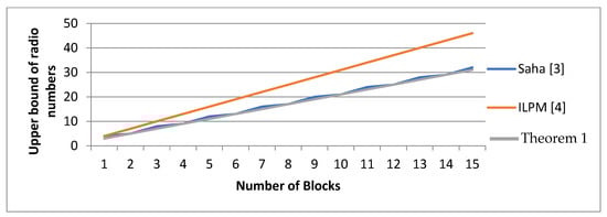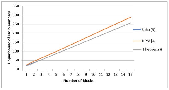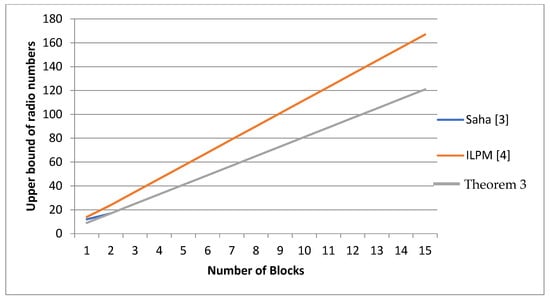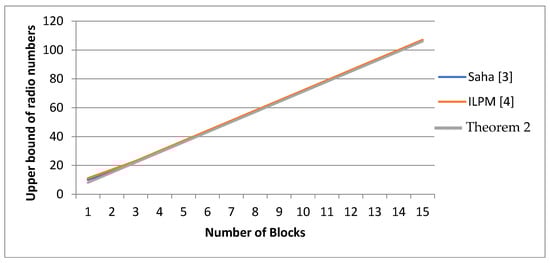 According to the upper bound of the radio number of , Table 3 and Figure 11 show that the proposed results in Theorem 3 outperform the proposed results in [] for .